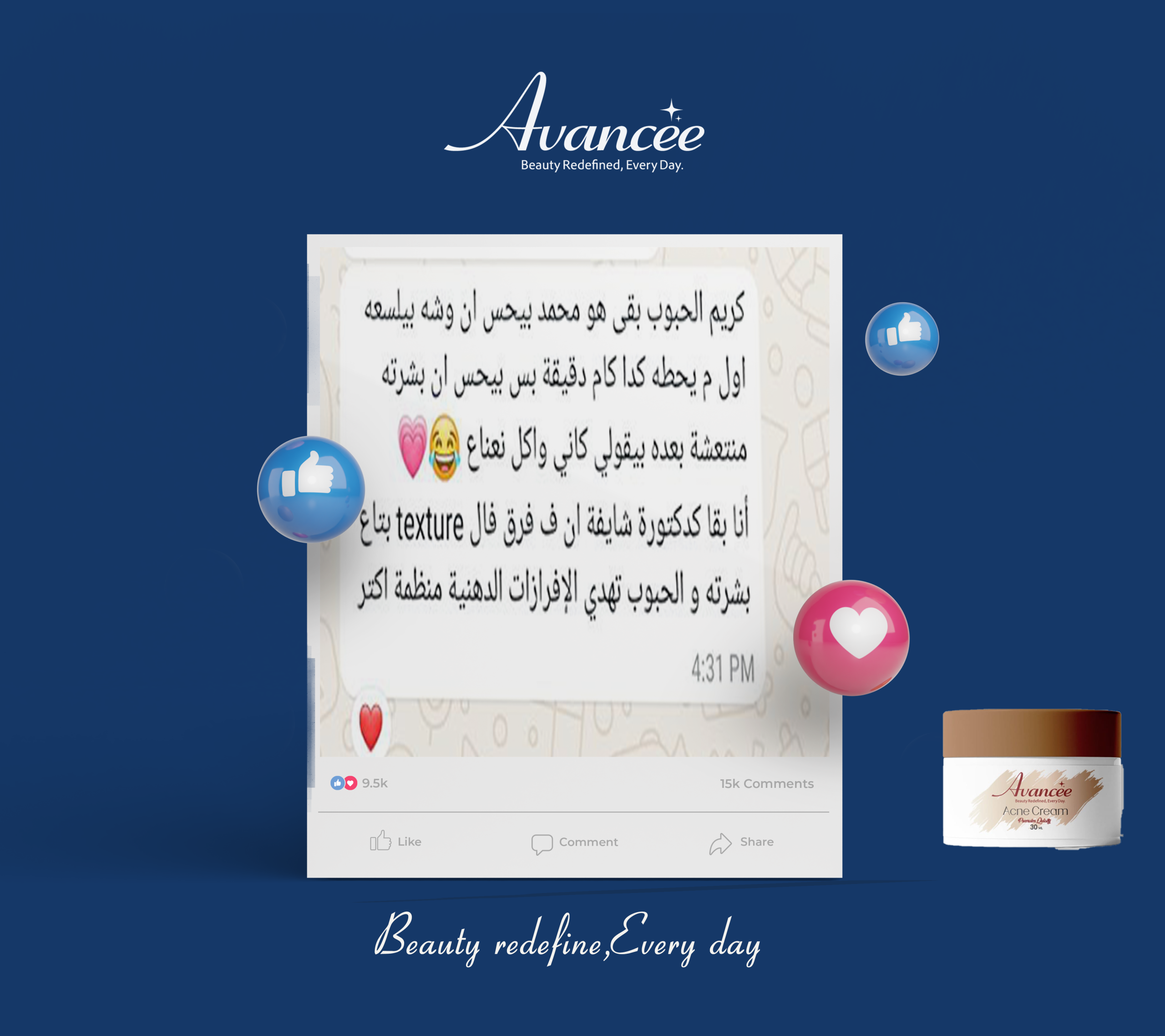 كريم الحبوب من Avancée هينشف الحبايه ف 12 ساعه و12 ساعه التانيه هيتخلص منها ودة معناة انك هتتخلصي من الحبوب ف 24 ساعه بس ودة لانه تركيبة متقدمة مصممة بواسطه متخصصين وجمعيه تكونت من اطباء جلديه وكيميائيين مش بس بتعالج الحبوب الظاهرة كمان بتشتغل على تهدئة البشرة، تنظيم إفراز الدهون، ودعم حاجز البشرة الطبيعي للحفاظ على بشرة صحية ومتوازنة
