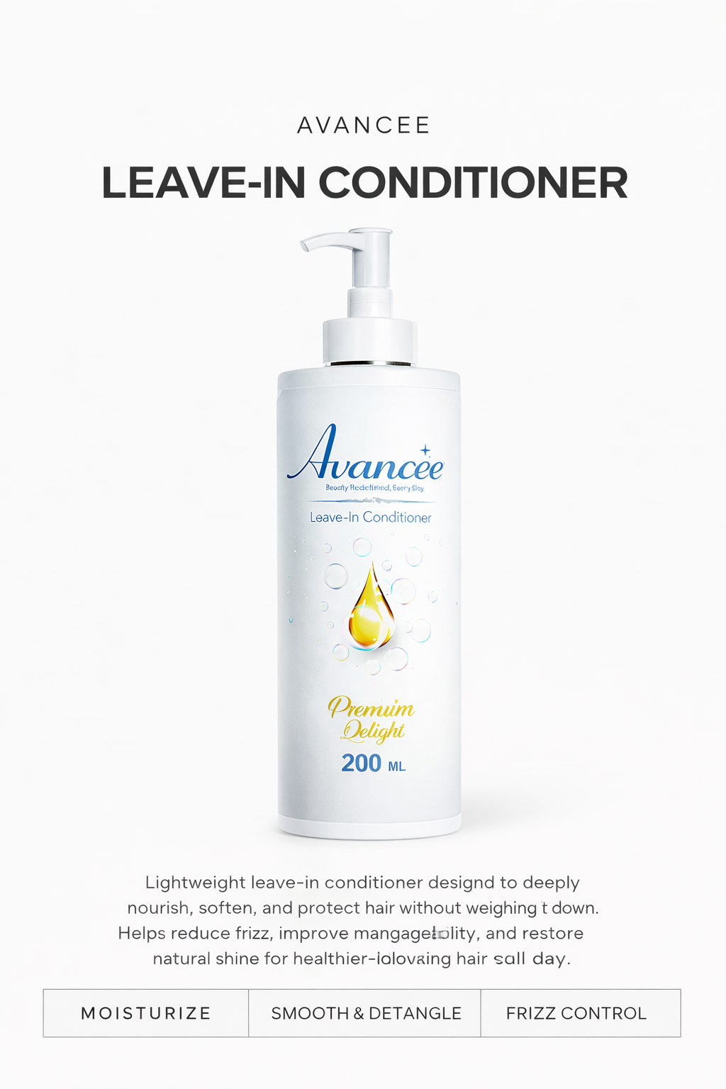 الحجم: يختلف حسب نوع العبوة (سبراي أو كريم) النوع: بلسم بدون شطف (LeaveIn Conditioner) الماركة: Avancée بلد المنشأ: مصر مناسب لـ: جميع أنواع الشعر الاستخدام: يومياً على شعر رطب أو جاف لا يُشطف: نعم حماية من الحرارة: نعم
